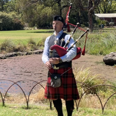Melbourne-based professional bagpiper with 30+ years of experience. I have competed at the highest level, performed at weddings, ceremonies, major sporting events and toured the world blending traditional bagpipes with contemporary rock with acclaimed band The Go Set.