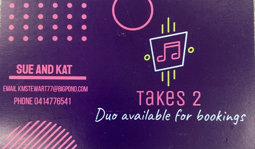 Takes Two are a covers duo consisting of two females with voices that blend effortlessly to create great harmonies. Having both been in bands separately over the years, they have now come together with a mutual love of music and singing to bring music to any event Be it birthdays, weddings or any event that needs that live music vibe.